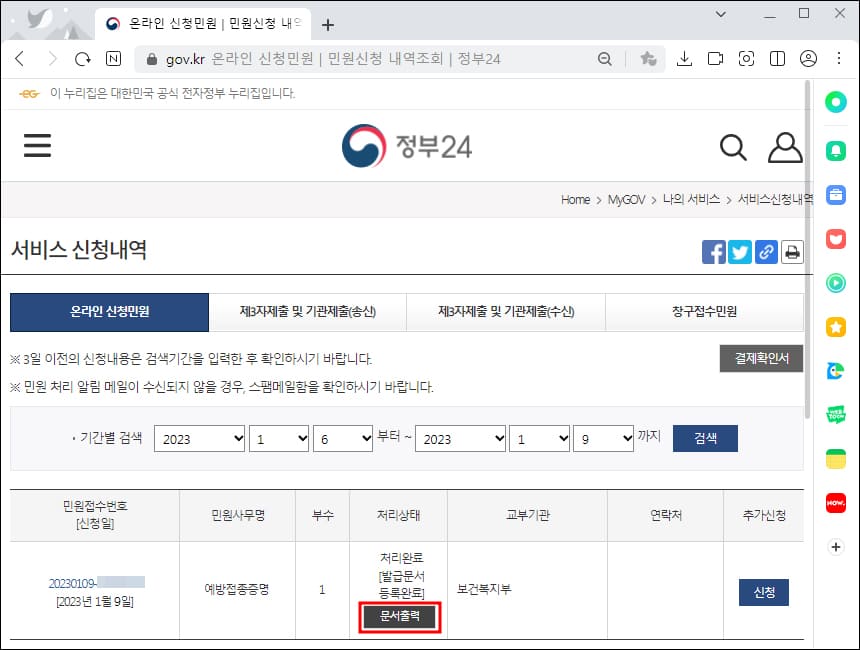 코로나19 백신 접종 증명서 인쇄를 위해서는 서비스 신청내역에 있는 처리상태를 확인해야 합니다. 발급문서가 등록되었다면 문서 출력을 합니다.