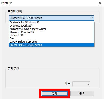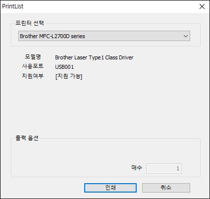 인쇄를 지원하는 프린터가 자동으로 선택됩니다. 혹시 PDF로 저장 기능이 지원되나 싶어서 다른 프린터들을 선택해 보니 사용할 수 없었습니다.