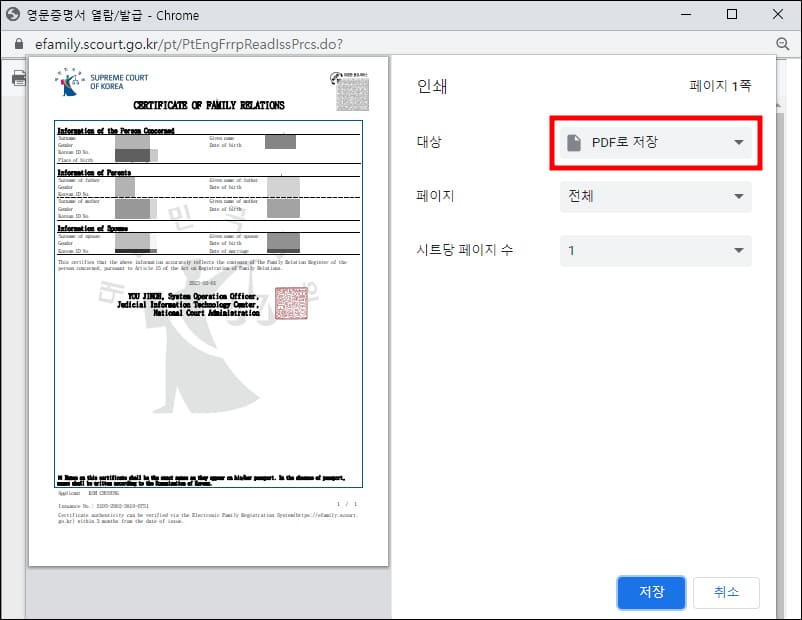 영문 가족관계증명서 인터넷 발급의 장점은 서류를 PDF로 저장할 수 있다는 것입니다. 해외여행을 준비 중이라면 PDF로 저장해 휴대폰에 파일을 저장해 두고 종이로 출력해서 함께 가지고 다니는 것을 추천합니다.