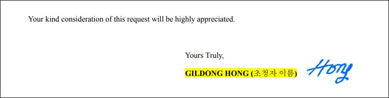 하단에는 정중한 감사의 인사와 함께 발신인(초청자)의 이름과 싸인을 넣습니다. 태국 공공기관에 제출하는 서류에는 파란색 펜을 쓰기 때문에 파란색으로 여권에 사용한 싸인을 작성하면 됩니다. 저희는 싸인을 스캔해서 파일에 첨부했습니다.