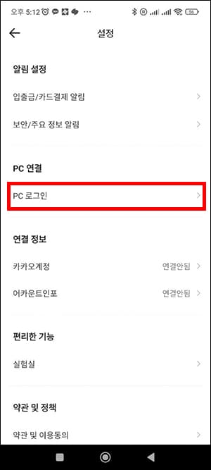 다시 카카오뱅크 모바일 앱에 들어가 점 3개 모양의 더 보기 메뉴 상단에 있는 앱 설정을 선택합니다. 설정 안에 있는 PC 연결의 PC 로그인을 누릅니다.