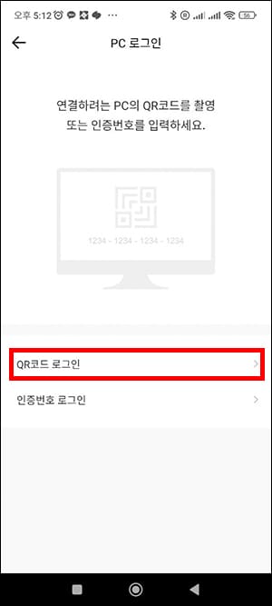 PC에서 보았던 것과 마찬가지로 QR코드 촬영 또는 인증번호 입력을 할 수 있습니다. QR코드 로그인을 선택하고 스마트폰으로 모니터에 나타난 QR코드를 활영합니다.