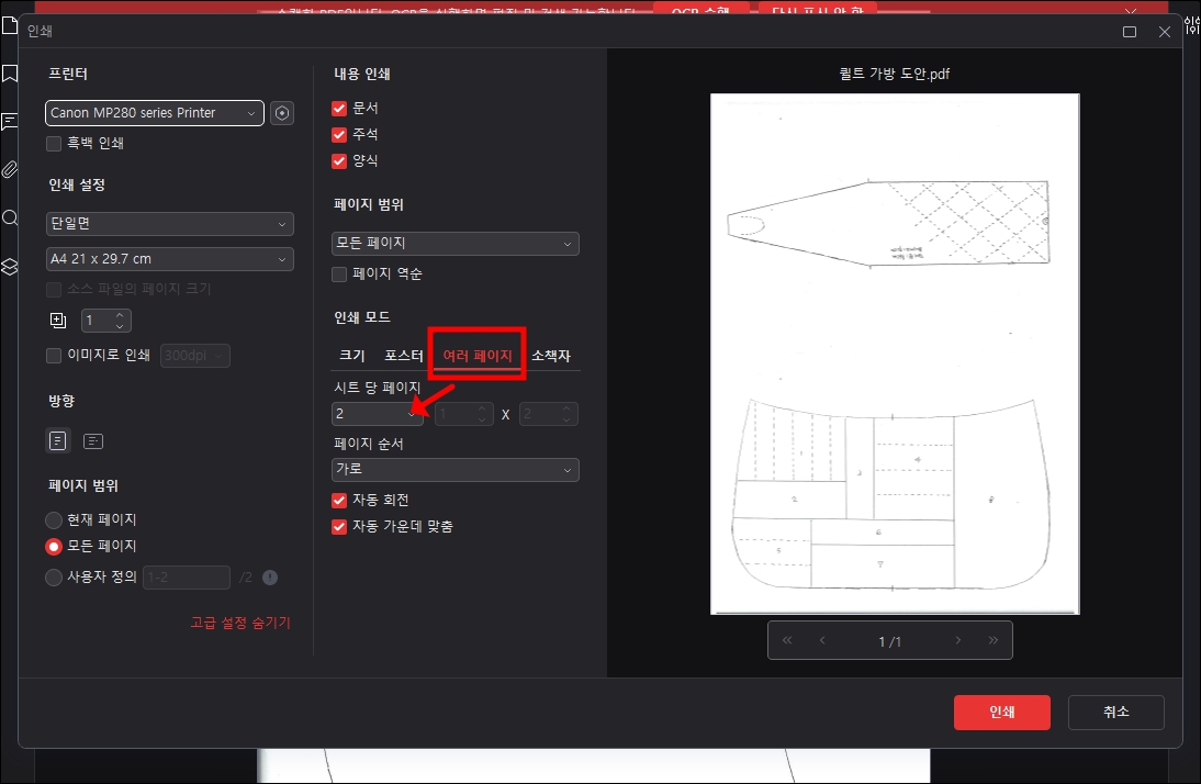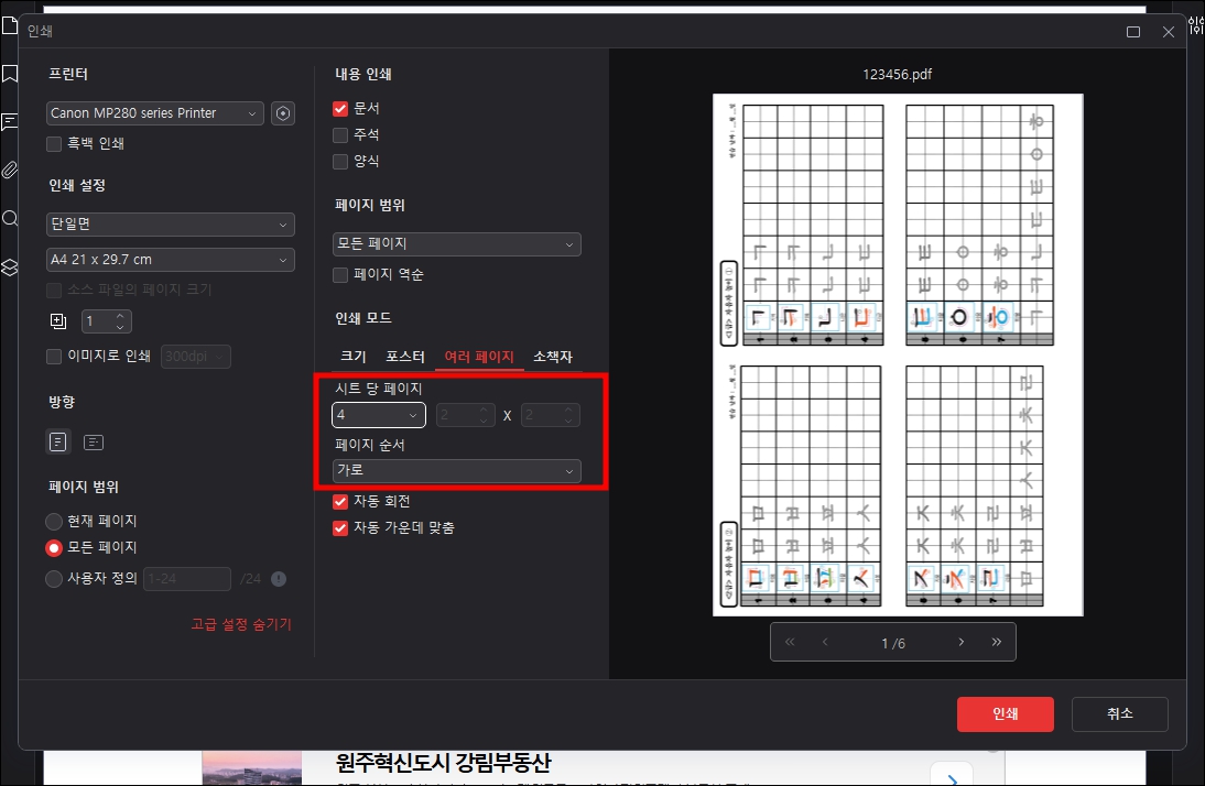 여러 페이지가 있는 PDF 파일을 열어 보았습니다. 시트당 페이지를 설정할 수 있고 페이지 순서도 정할 수 있습니다.