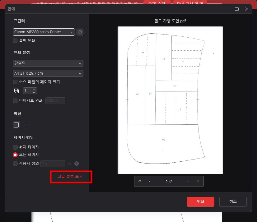 인쇄 설정 화면이 나오면 하단에 있는 고급 설정 표시를 선택해 주세요. 이 기능을 통해서 인쇄 크기를 변경할 수 있습니다.
