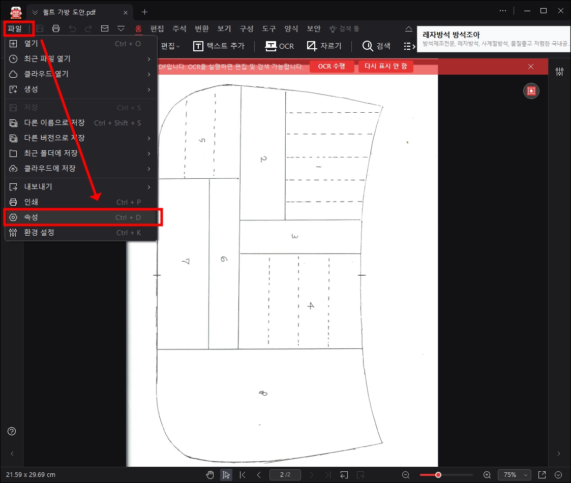 원래 PDF 파일의 페이지 크기를 잘 모르겠다면 확인하는 방법을 알려드리겠습니다. 알PDF에서 파일을 연 후 단축키 ctrl+D를 누르거나 파일 메뉴에서 속성을 선택하면 됩니다.