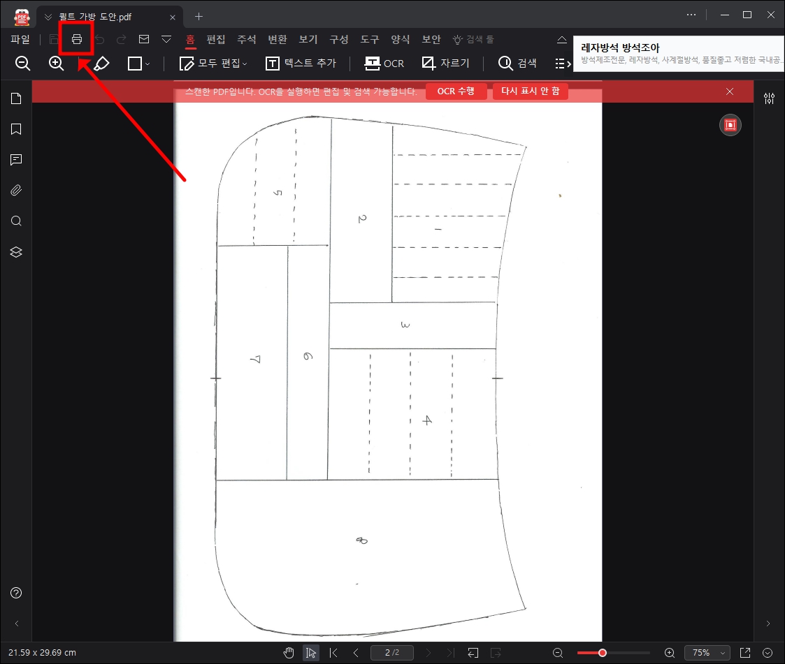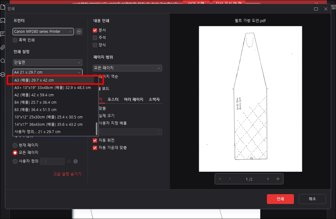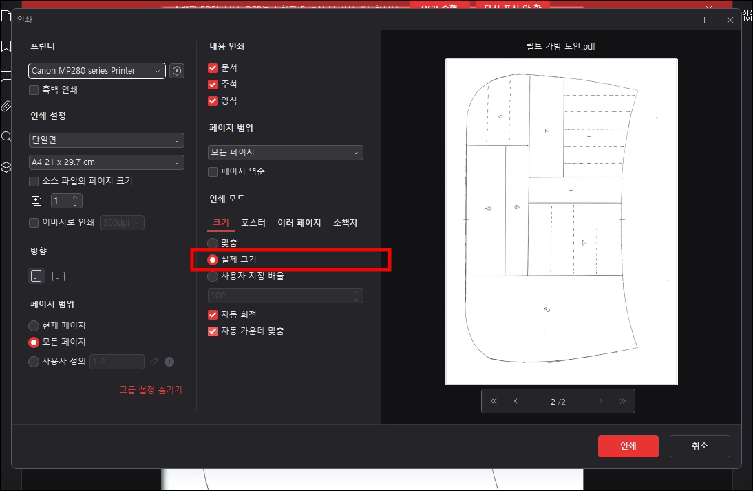 PDF 원본 사이즈 그대로 출력하는 게 중요한 서류들이 있습니다. 설계도나 패턴, 도안 등은 오차에 예민하므로 원본 사이즈 출력이 중요합니다.