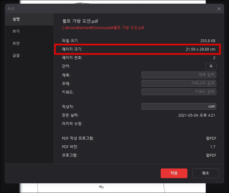 페이지 크기에서 가로*세로 사이즈를 확인할 수 있습니다.