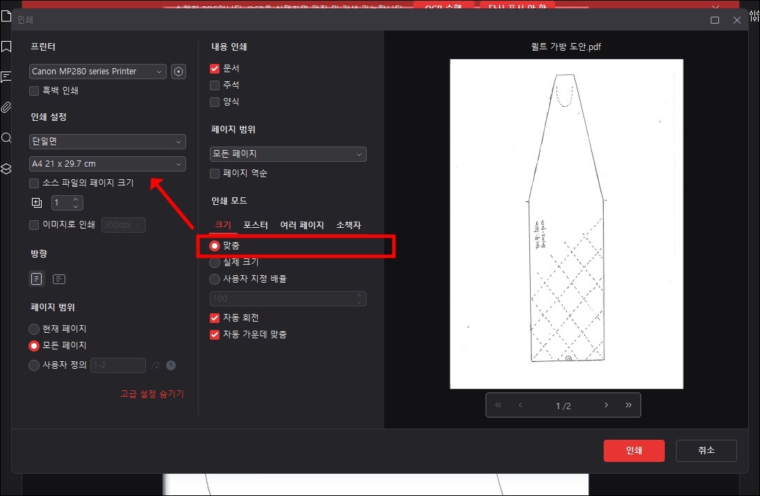 이 기능은 PDF 파일의 사이즈가 크게 설정되어 있어도 사용하는 프린터가 인쇄할 수 있도록 종이 크기에 맞추도록 하는 것입니다. 대부분의 프린터는 A4 사이즈의 종이를 지원합니다.