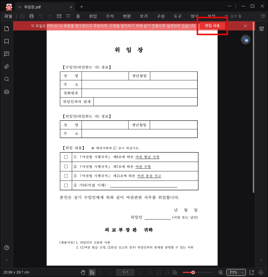 알PDF에서 도장 삽입을 하고 싶은 파일을 엽니다. 공공기관 등에서 배포한 서류를 열면 'PDF/A-1b 표준을 준수한다고 주장하며, 수정을 방지하기 위해 읽기 전용으로 설정되어 있습니다.'라는 안내문구가 상단에 뜹니다. 이럴 때는 오른쪽에 있는 편집 사용 버튼을 누릅니다.