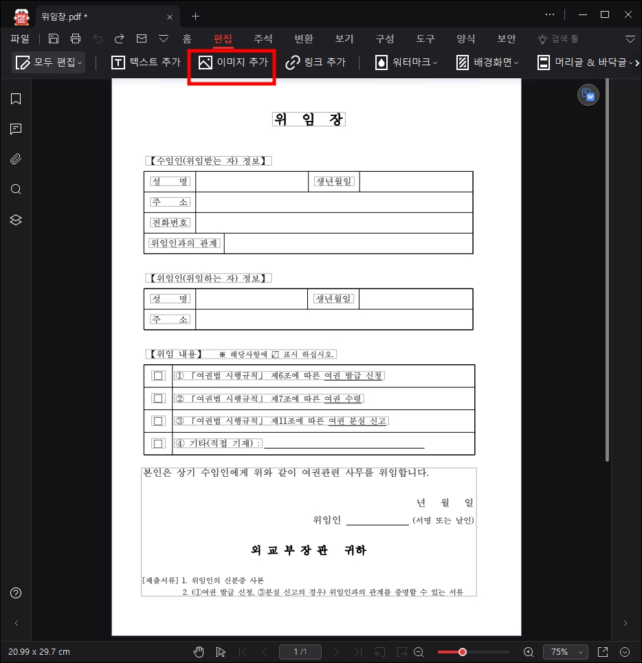 이제 알PDF 도장 삽입을 해 보겠습니다. 편집 메뉴에서 이미지 추가를 해주세요.