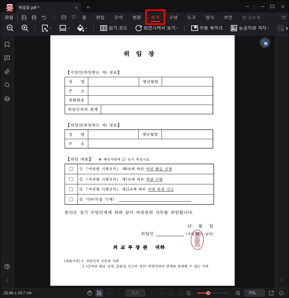 보기 메뉴로 들어가면 PDF 편집에서 보이던 안내선들이 보이지 않습니다. 이 상태에서 도장의 위치를 다시 한번 확인하고 수정하거나 저장, 내보기 등을 하시면 됩니다.