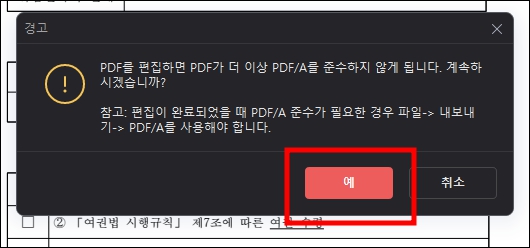 알람창이 뜨면 예를 누르고 진행합니다. 편집이 완료되었을 때 PDF/A 준수가 필요하다면 내보내기 기능을 이용하면 된다는 것을 기억해 두시기 바랍니다.